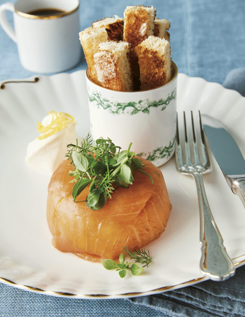 Den Backofen auf Grillstufe einschalten. Vier kleine ofenfeste Förmchen (ø 7 cm, 2,5 cm hoch) mit Räucherlachsscheiben auslegen, sodass rundherum ein Überhang entsteht, der ausreicht, um die Oberfläche der Förmchen damit zu bedecken.