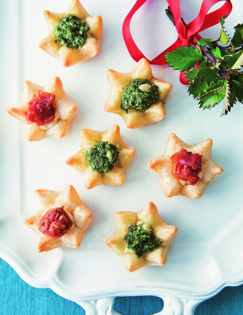 Diese hübschen kleinen Blätterteigsterne sind blitzschnell zubereitet – und sicher ebenso schnell verspeist! Bei der Füllung kann man variieren, aber ich finde, die Kombination aus halbgetrockneten Tomaten, Pesto und Ziegenkäse ist besonders lecker und passt auch farblich wunderbar in die Weihnachtszeit.
