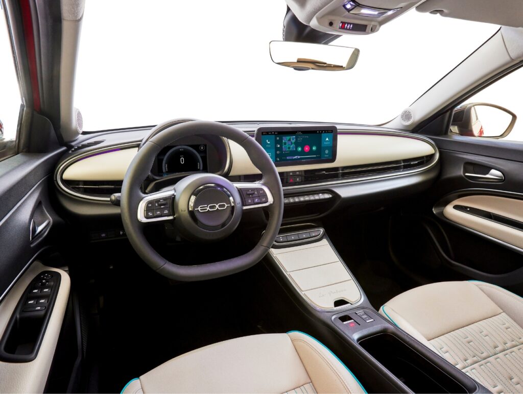 Der Fiat 600e bietet fünf Türen und die Staufächer im Innenraum fallen mit einem Gesamtvolumen von 15 Litern äußerst großzügig aus. Hier ist also sogar für Großeinkäufe Platz.