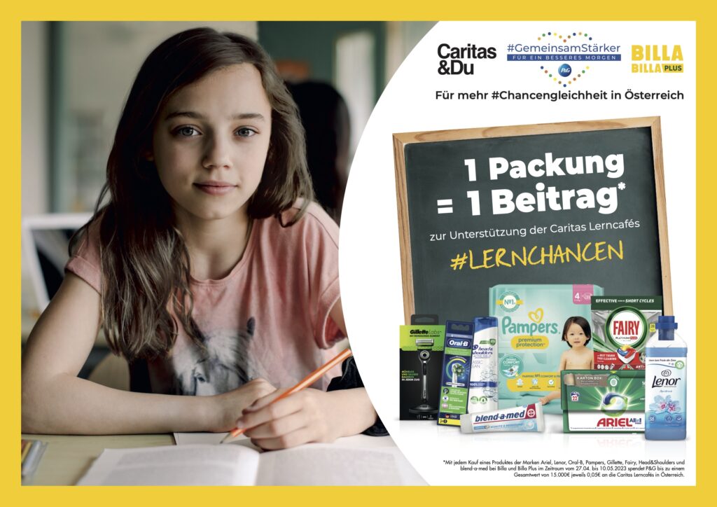 Bildung ist ein Menschenrecht, das leider noch immer vielen Kindern und Jugendlichen in Österreich weitestgehend verwehrt bleibt. So haben beispielsweise junge Menschen aus einkommensschwachen Familien sowie Kinder und Jugendliche mit Migrationshintergrund und nichtdeutscher Muttersprache nachgewiesenermaßen geringere Bildungschancen. Mit der Spendenkampagne #Lernchancen möchte P&G zusammen mit BILLA von 27. April bis 10. Mai 2023 sowie von 31. August bis 13. September 2023 bis zu 30.000 EUR an Spenden für die österreichweit 67 Lerncafés der Caritas sammeln.