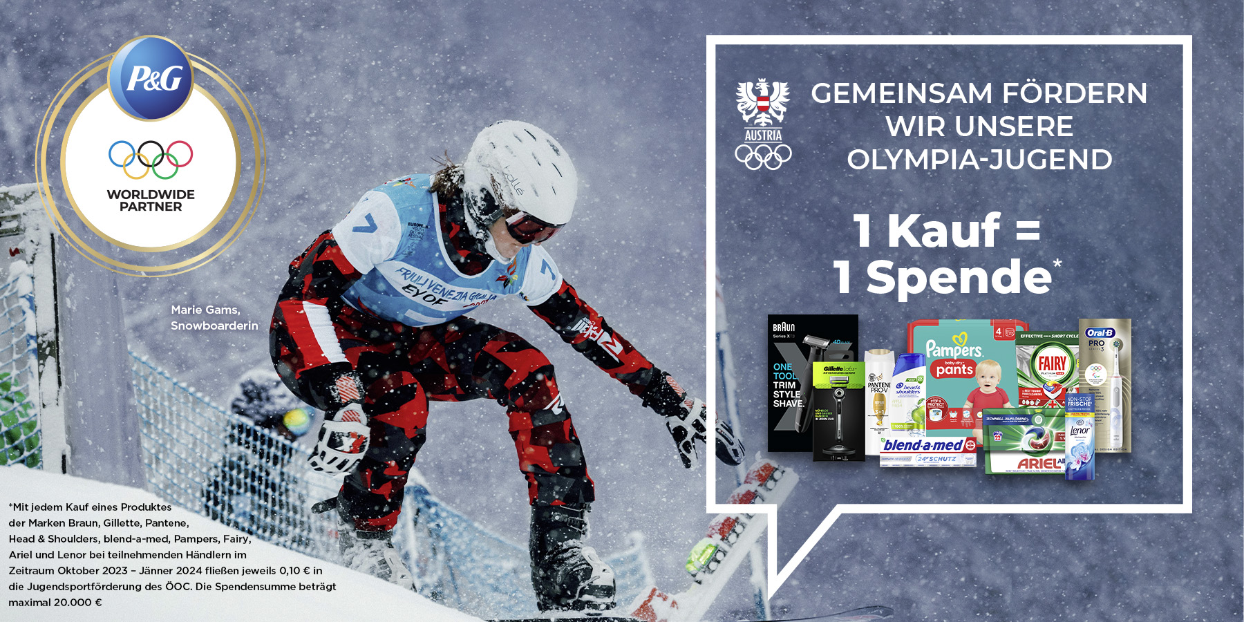 Im Rahmen von #HöchstleistungJedenTag spendet P&G Österreich an die Jugendförderung des Österreichischen Olympischen Comitées (ÖOC). Für jedes verkaufte Produkt der P&G-Marken Ariel, Lenor, Oral-B, Braun, Pampers, Gillette, Pantene, h&s, blend-a-med und Fairy füllt sich der Spendentopf im Aktionszeitraum Oktober 2023 bis Jänner 2024 um 10 Cent. Bis zu 20.000 Euro sollen so für die Jugendförderung des ÖOC gesammelt werden, um aufstrebende Jugendsportler:innen zu fördern und sie auf dem Weg zu den Olympischen Spielen zu unterstützen.