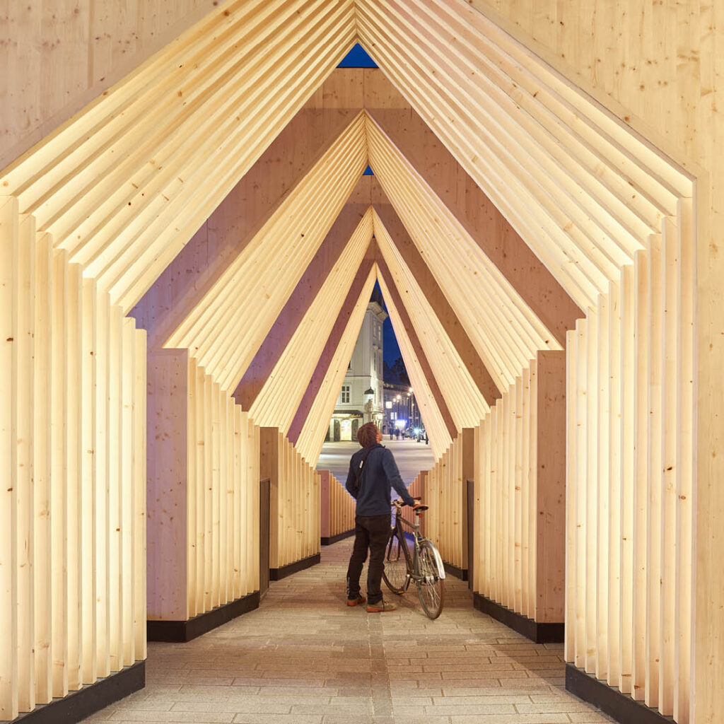 PICS Cornelia Hefel // »Licht-Kreuz-Skulptur« vor dem Antoniushaus in Feldkirch, 2023 || kurt hörbst // »Woodpassage – vom Baum zum Haus« in Bozen, Silvius-Magnago-Platz, Juni 2023.